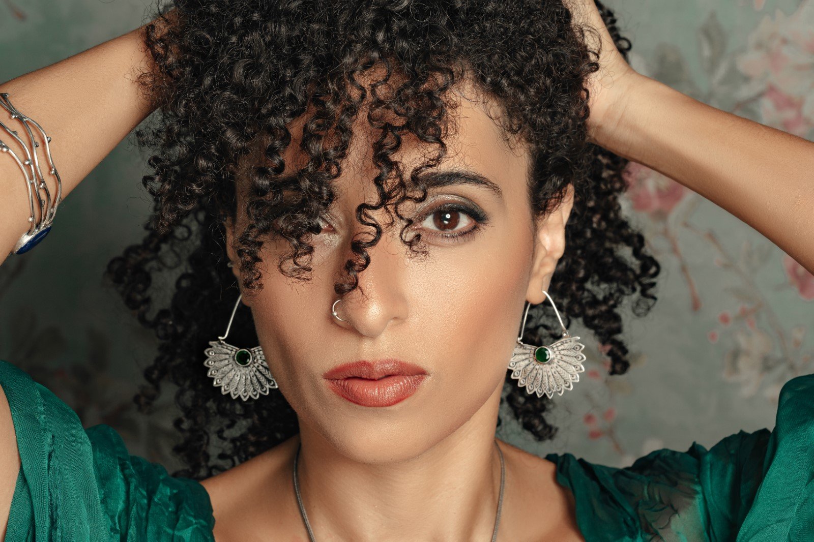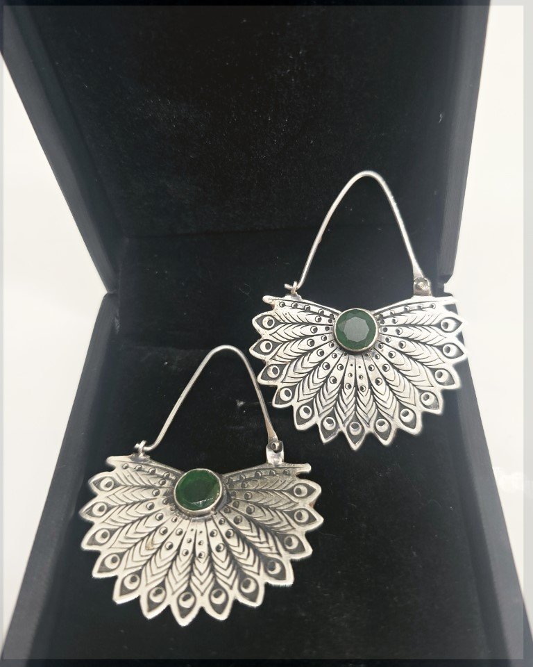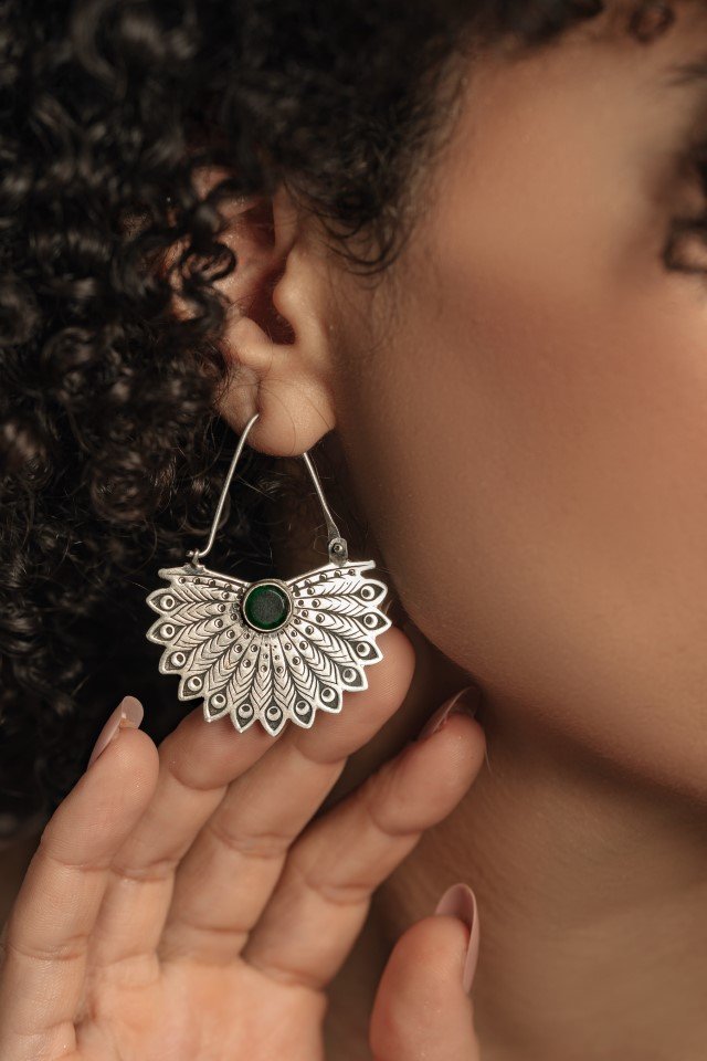 hung in her ears, earrings shaped like the open wings of a peacock…